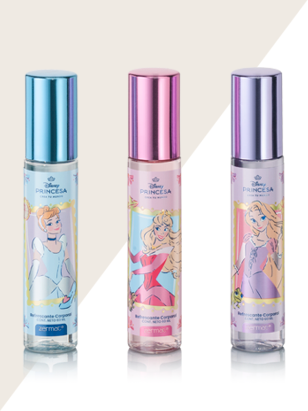Estuche con 3 refrescantes corporales de princesas.